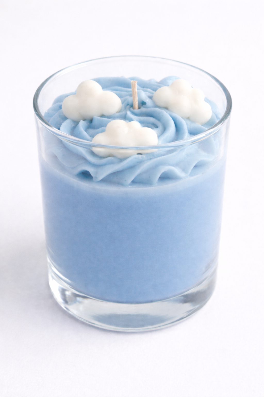 Η απαλή γαλάζια βάση συναντά την ανάλαφρη whipped επιφάνεια, διακοσμημένη με μικρά λευκά συννεφάκια, δημιουργώντας ένα ονειρικό αποτέλεσμα που θυμίζει καθαρό ουρανό και ηρεμία.