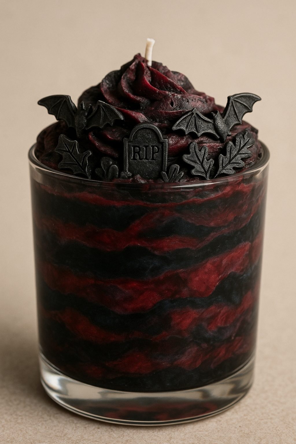 Με 330γρ premium φυτικό κερί, χειροποίητες αποχρώσεις κόκκινου και μαύρου που θυμίζουν αίμα και σκιές, και gothic διακόσμηση με νυχτερίδες, φύλλα και την κλασική ταφόπλακα “RIP”, είναι ένα must-have για κάθε φαν της σειράς αλλά και για όσους αγαπούν το dark aesthetic.