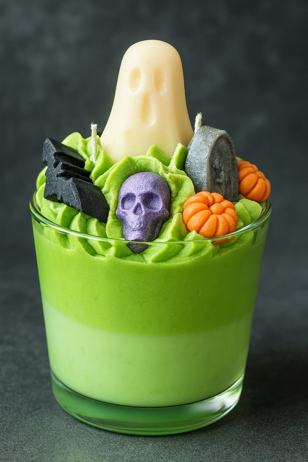 Ζήσε τη μαγεία και το μυστήριο του Halloween με το Mystic Graveyard Candle. Ένα εντυπωσιακό, χειροποίητο κερί σε φωσφοριζέ πράσινο χρώμα, διακοσμημένο με μικρά γλυπτά από κερί – φάντασμα, ταφόπλακα, κρανίο, κολοκύθες και νυχτερίδα – που δίνουν μια αληθινά ατμοσφαιρική και spooky αισθητική. Ιδανικό για να διακοσμήσει τον χώρο σου και να γεμίσει το σπίτι με αρώματα φθινοπωρινής θαλπωρής.