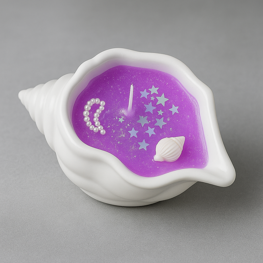 Το "Purple Dream" είναι ένα χειροποίητο κερί σε λευκή κεραμική βάση σε σχήμα κοχυλιού, γεμάτο μοβ απόχρωση που ακτινοβολεί λάμψη και κομψότητα. Διακοσμημένο με μικροσκοπικά κοχύλια, πέρλες, αστεράκια και χρυσόσκονη, δημιουργεί μια μαγική και ρομαντική καλοκαιρινή αίσθηση. Ιδανικό για διακόσμηση, χαλάρωση, ή για να προσφερθεί ως ένα εντυπωσιακό δώρο.